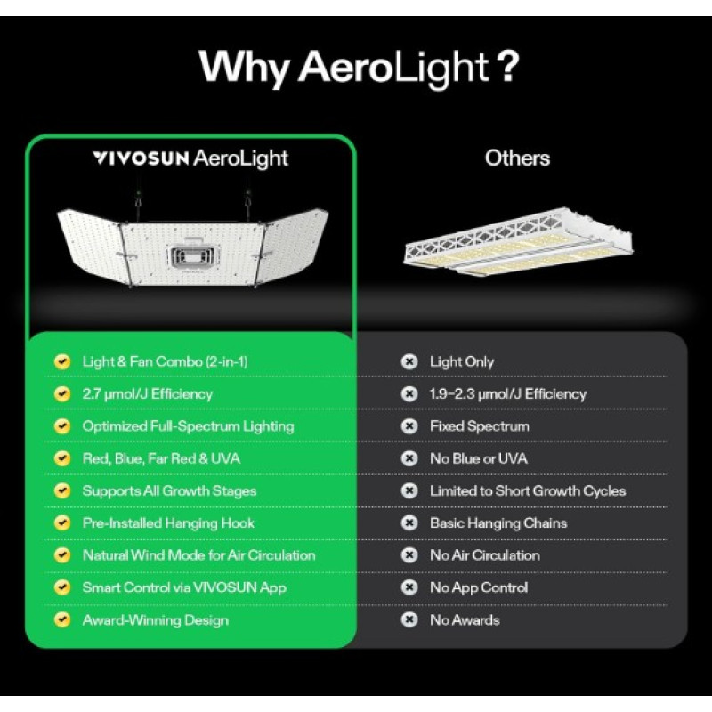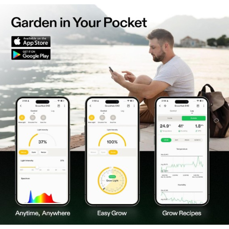 AeroLight Wing легко интегрируется в умную экосистему VIVOSUN. Подключение к GrowHub E42A/E42/E25 (покупаются отдельно) открывает доступ к автоматическим суточным циклам, имитации рассвета и заката, плавной регулировке интенсивности, предустановленным сценариям освещения и управлению воздушным потоком.