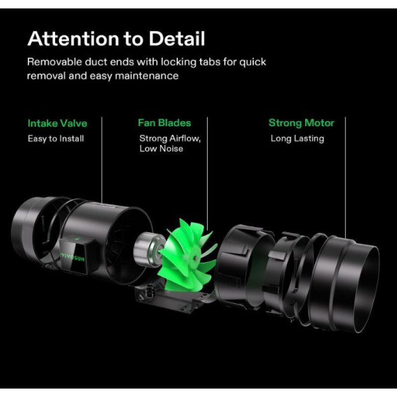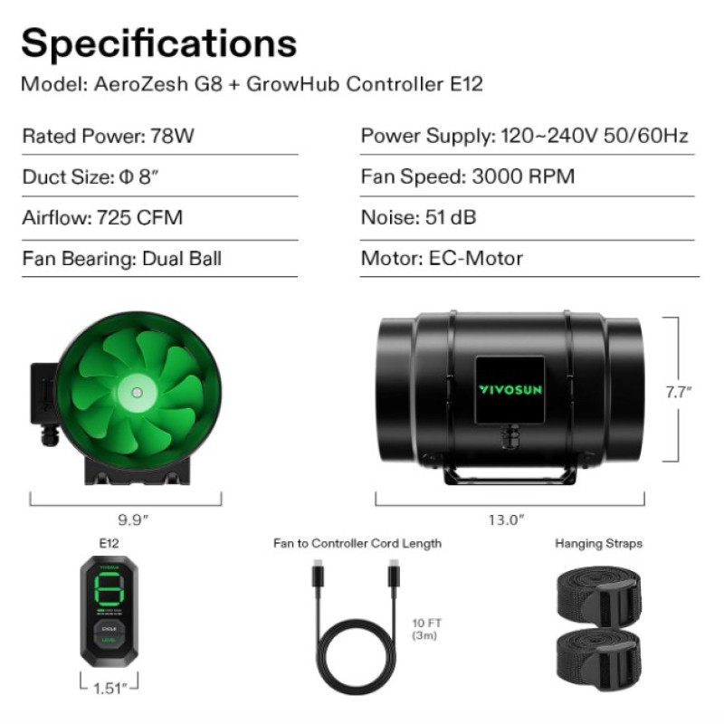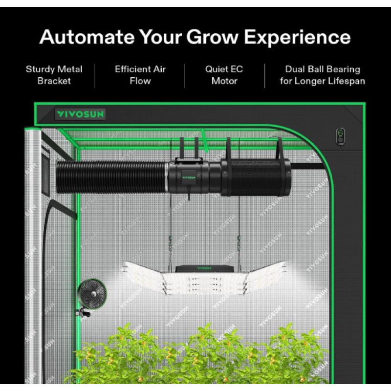 VIVOSUN AeroZesh G8 – это 8-дюймовый (200 мм) инлайн EC-вентилятор нового поколения, разработанный для профессиональной вентиляции гроубоксов, теплиц и помещений для выращивания.