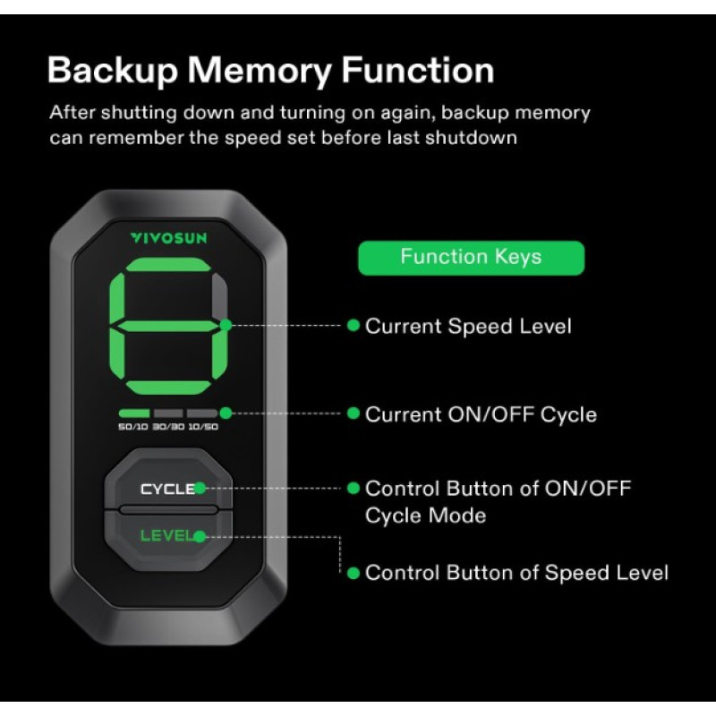 - Управление: E12 Speed Controller (PWM, 10 скоростей, циклы, память)