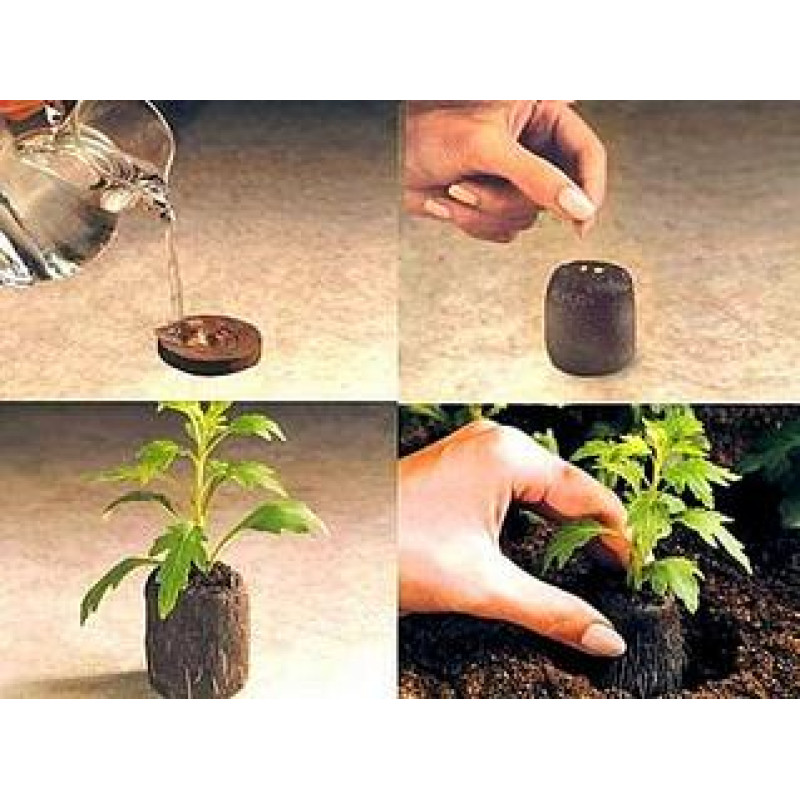 Таблетки залейте теплой водой. При этом таблетка, сохраняя диаметр, увеличивается в высоту в 5 раз , превращаясь в торфяной цилинр и не распадается , благодаря сетке. Посадите в таблетки семена и закройте тепличку прозрачной крышкой. Преимущество таблеток в том, что растение вместе с таблеткой пересаживается прямо в грунт.