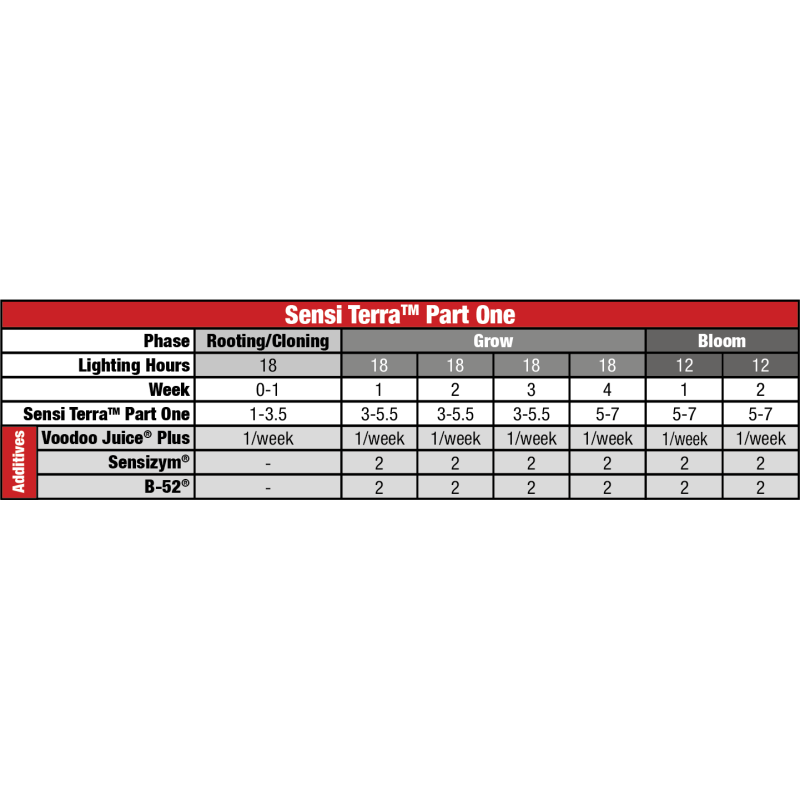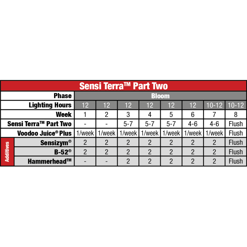 Маловідомий факт, що канабісу потрібне зниження азоту приблизно на другому тижні цвітіння, коли рівень калію має збільшитися. Це лише частина того, що робить Sensi Terra™ від Advanced Nutrients таким унікальним. Почніть підгодовувати рослини Sensi Terra™ Part One від самого початку його життєвого циклу, продовжуйте під час переходу від вегетації до цвітіння, а потім перейдіть на Sensi Terra™ Part Two на другому тижні цвітіння. З Sensi Terra™ Part Two ваші рослини отримують знижену кількість азоту та оптимальне співвідношення фосфору та калію, необхідні для максимального виробництва каннабіноїдів та терпенів у відповідний час.