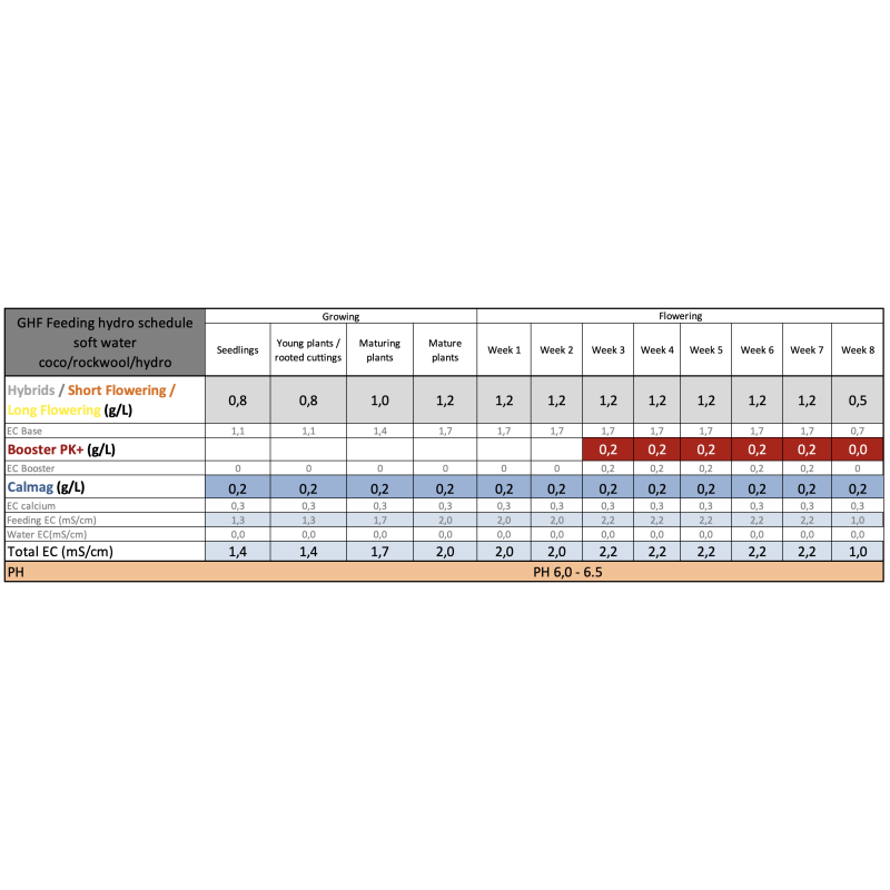 - У разі м'якої води (зворотний осмос/дощова вода) додайте 0,5 г/л (0,6 EC).
