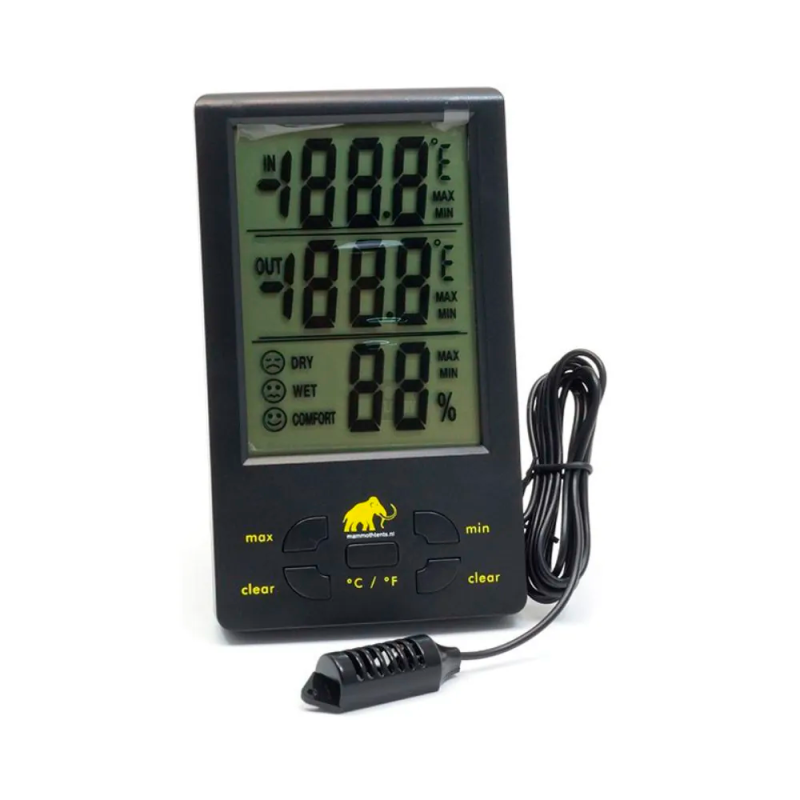 Термогігрометр XXL Mammoth — точний та зручний прилад для одночасного контролю температури й вологості у двох зонах. Ідеально підходить для гроубоксів, теплиць, погребів та будь-яких приміщень, де важливо підтримувати стабільний мікроклімат.