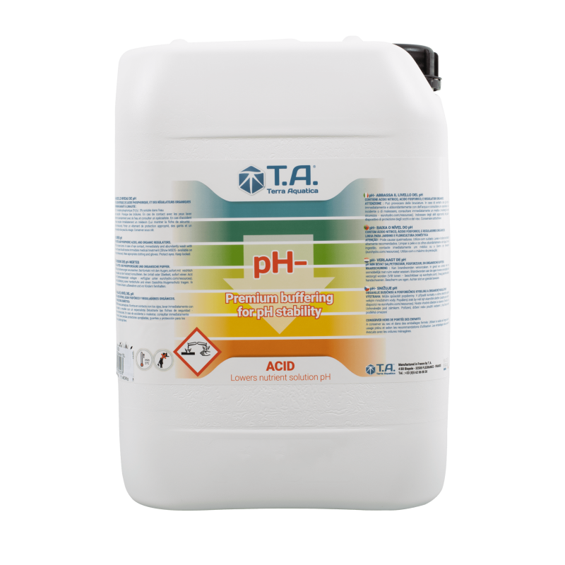 Terra Aquatica pH – використовує азотну та фосфорну кислоти, щоб зробити початкову важку роботу зі зміни pH води, а їх поєднання означає відсутність порушень співвідношення N/K під час росту та цвітіння, а також відсутність нальоту на поверхні вашого резервуара. Потім органічна лимонна кислота, що має свої особливі характеристики, нейтралізує зміни pH з часом, роблячи ваш поживний розчин більш стабільним і допомагаючи справлятися з надлишком кальцію в регіонах з жорсткою водою, до яких належить і Україна.