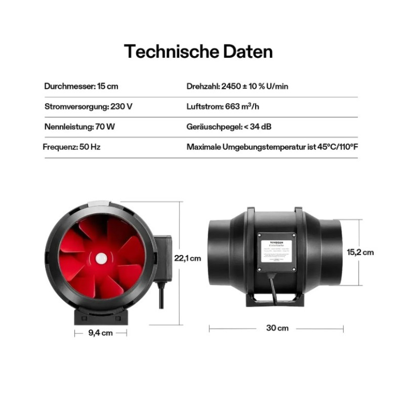 VIVOSUN R6 Inline Fan – це високопродуктивний витяжний вентилятор для гроубоксів середнього та великого розміру. Завдяки швидкості обертання 2550 об/хв і потужному повітряному потоку 663 м³/г, він ефективно переміщує повітря у приміщенні, забезпечуючи рослинам стабільний мікроклімат для здорового росту й розвитку.