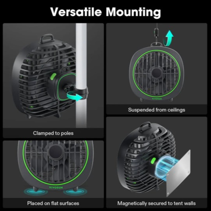 - Различные варианты монтажа – вентилятор можно установить на ровную поверхность, закрепить клипсой, подвесить к потолку или даже прикрепить магнитом к металлической поверхности (пластина не входит в комплект).